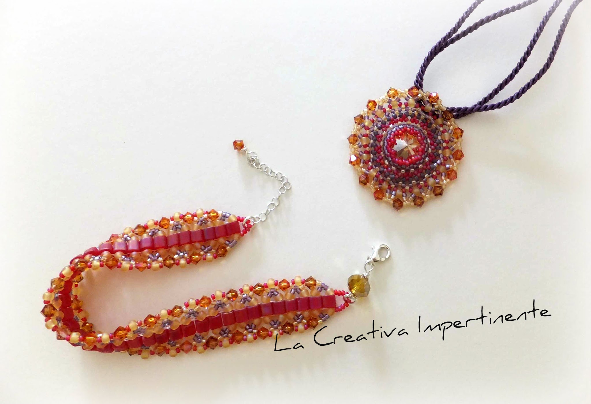 Per il ciondolo ho seguito lo schema che feci in uno dei miei primi medaglioni con perline, sempre inventato da me e rivisto e corretto per questa creazione.