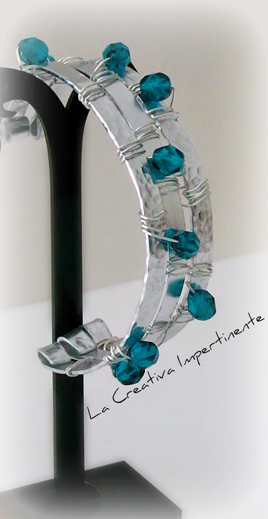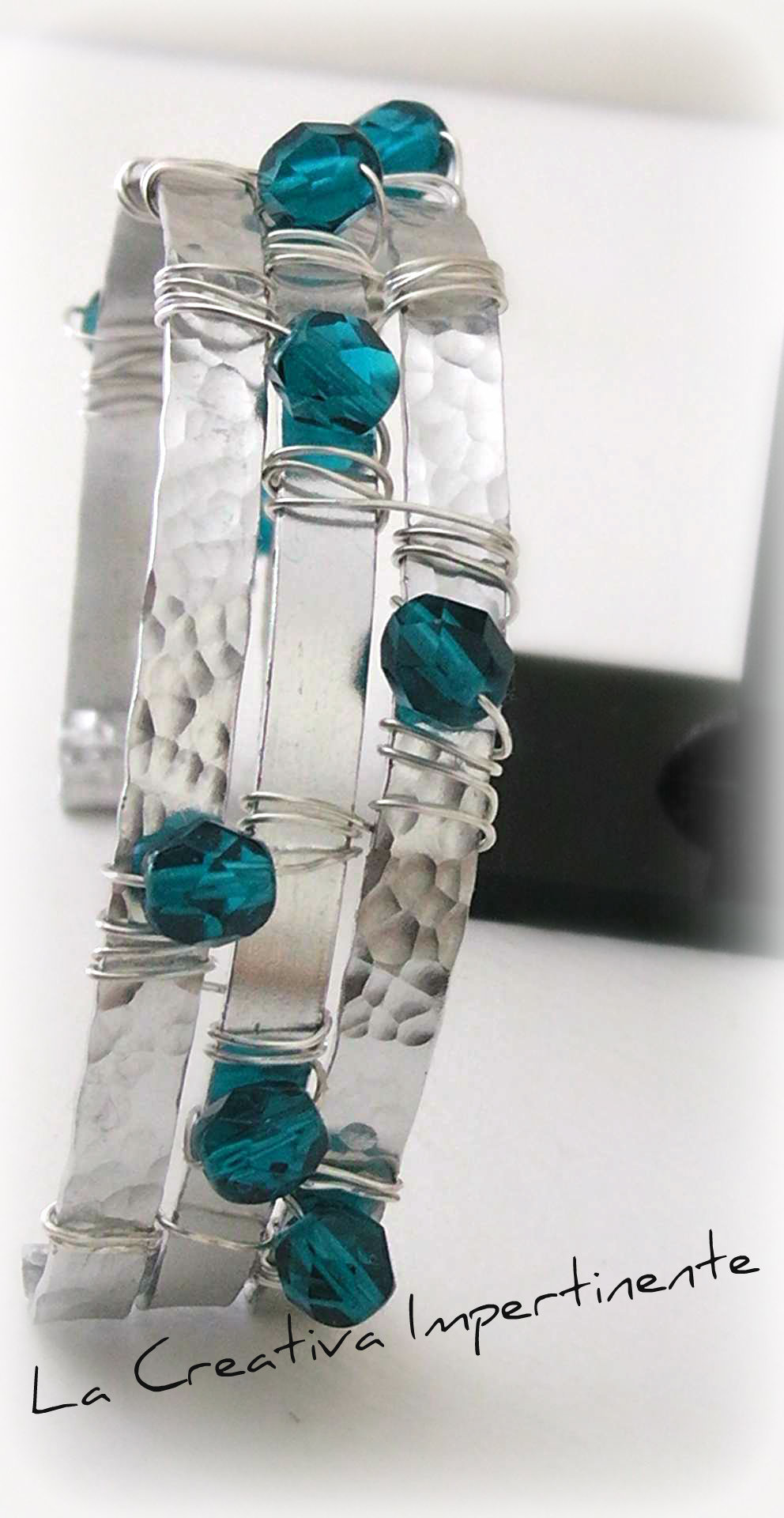Seguendo l’ispirazione del nastro di alluminio, ho realizzato questo bracciale unendo l’effetto lucido e liscio con la lavorazione martellata.