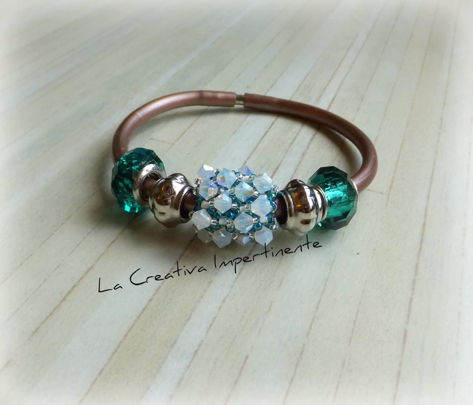 Oggi vi presento un bracciale in caucciù con un componente tutto speciale … questa perla realizzata a mano seguendo la tecnica del capricho.